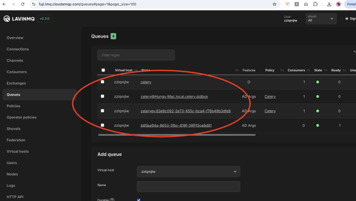 CloudAMQP: This is comparable to a cloud message box that Celery uses to get commands. Although it uses RabbitMQ, CloudAMQP makes it very easy to use and doesn't require any setup.