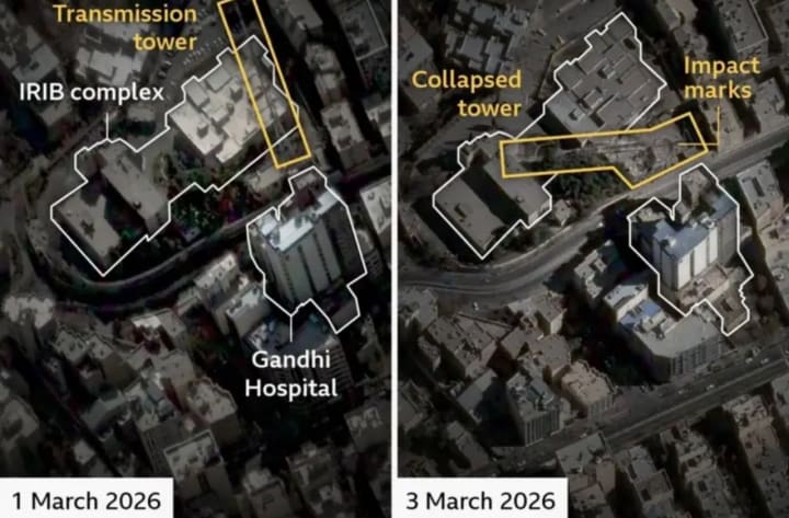 Satellite images recorded on March 3 show that a television broadcasting tower within the Iranian Broadcasting Corporation compound had collapsed, along with visible signs of the strike.