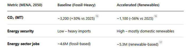 This shows that in the renewables scenario, emissions drop and energy security and jobs rise relative to business-as-usual[16][17].