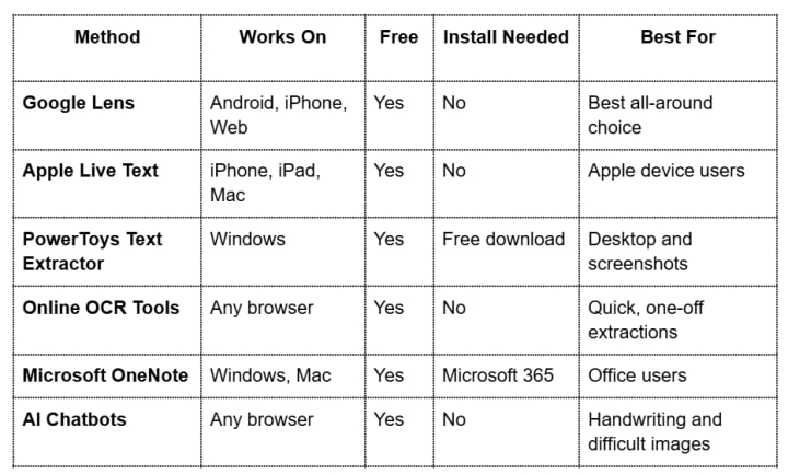 On iPhone or Mac, use Apple Live Text. On Android, Google Lens is already on your phone. On Windows, Microsoft PowerToys gives you a keyboard shortcut that works on anything on your screen. For a quick, browser-based solution on any device, any of the free online OCR tools listed above will work.