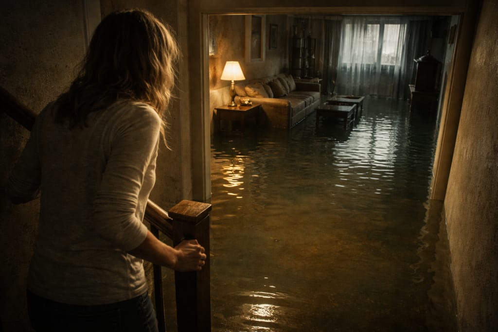 And inside the house, the water pressed calmly against the third stair, reflecting everything above it with perfect, undisturbed clarity.