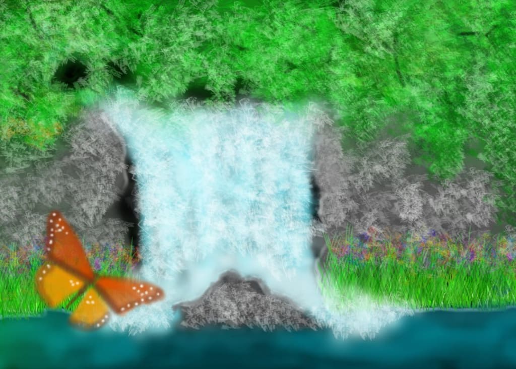 Instantly Kurt and Tizzy veer left, just as sunset starts to color the earth and the water begins to sound; we jog through vegetation that seems green and vibrant even as the land is torn up, and as the water's call begins to roar, we walk, the animals here much more alert, they keep out of our view, and away from Tizzy. We come to a stop at a waterfall's home, the water cascading in ways that allow that it might, or might not, have a cave behind it. With the variant flora and fauna around the perimeter and dipping nimbly into the water, it's a delightful oasis!