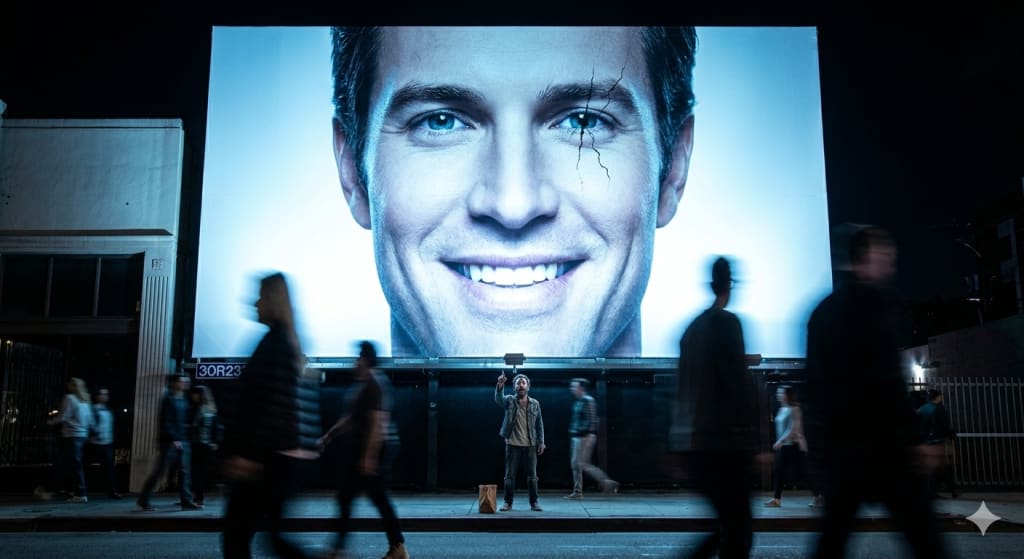 High above Sunset Boulevard, a massive, backlit monument of glass and chrome announced the arrival of the "New Sovereignty." The faces fifty feet tall, glowing with a divine, unnatural light.