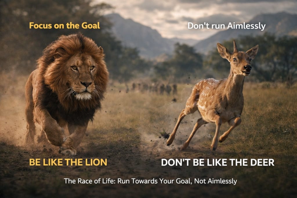 Success in life is not just about speed; it is about focus, determination, and persistence. The story of the lion and the deer teaches us that: