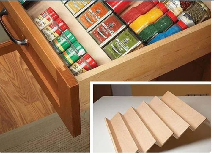 If your spices are jammed into a drawer with only the tops visible, this nifty rack that slips neatly into the drawer will solve the pantry storage problem. And it only takes an hour to build. Make it with scraps of 1/4-in. and 1/2-in. plywood. Or build a two-tier drawer spice rack. Check out the easy-to-follow instructions here.