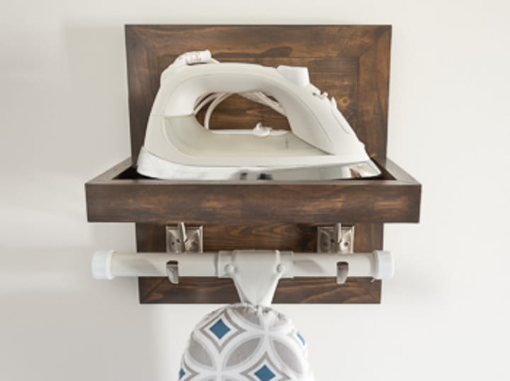 To keep your ironing gear handy but out from underfoot, make this simple ironing center in a couple of hours for some small room organization. All you need is a 10-ft. 1×8, a 2-ft. piece of 1×6 for the shelves, and a pair of hooks to hang your ironing board.