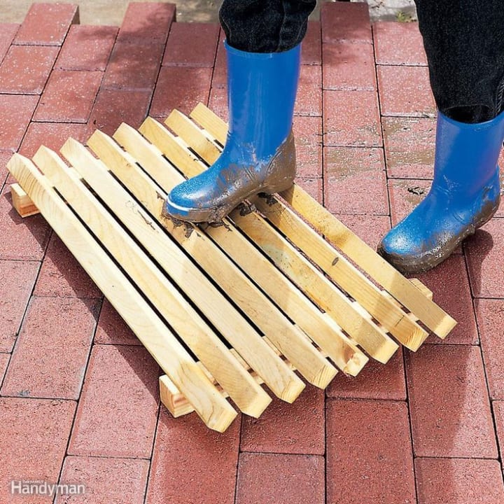 Here’s a traditional Swedish farm accessory for gunk-laden soles. The dimensions are not critical, but be sure the edges of the slats are fairly sharp they’re what makes the boot scraper work. Cut slats to length, then cut triangular openings on the side of a pair of 2x2s. A radial arm saw works well for this, but a table saw or band saw will also make the cut. Trim the 2x2s to length, pre-drill, and use galvanized screws to attach the slats from out the easy-to-follow instructions here.