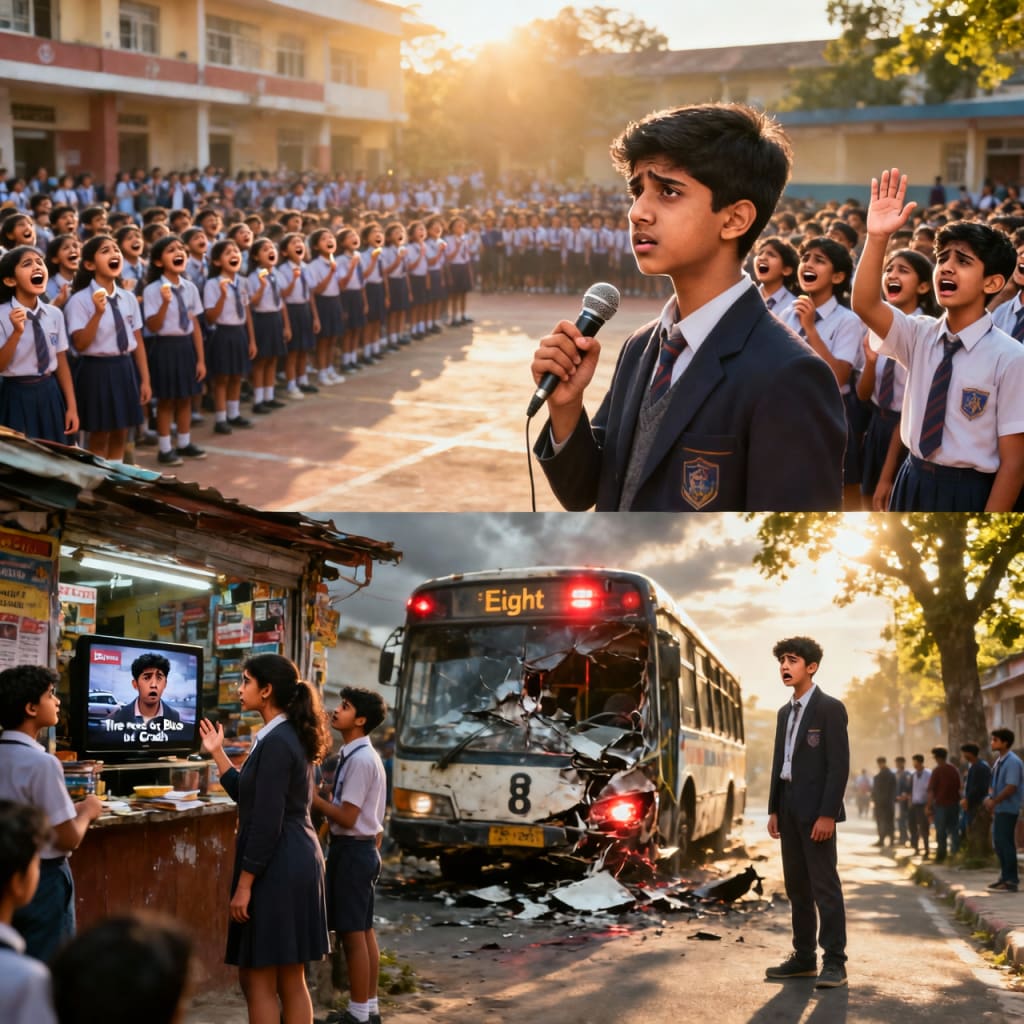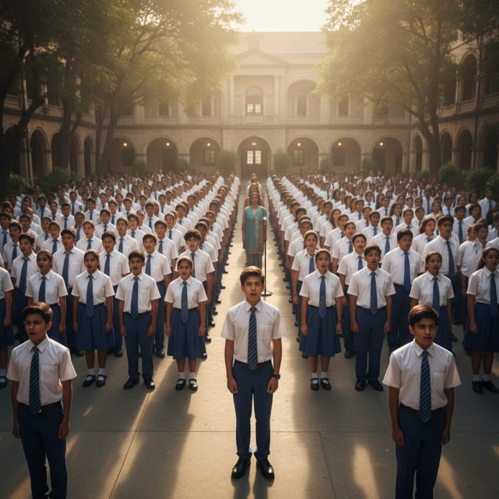 The school courtyard was full of morning light. Students stood in long rows wearing their uniforms, waiting for the daily assembly to begin. The loudspeaker crackled softly as teachers moved around organizing the lines.