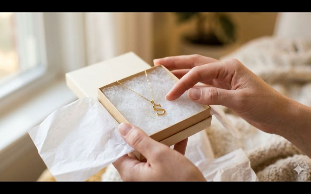 She unwraps the tissue paper slowly, fingers already trembling a little. Inside, on a bed of white cotton, sits a delicate gold necklace with a single letter hanging from the chain. Her letter. She does not say anything for a moment. She just holds it.
