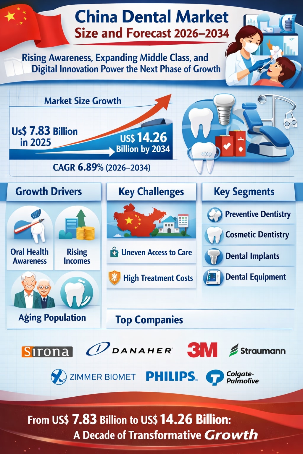 The dental market in China is entering a transformative decade. Once considered a secondary segment of healthcare, dentistry is now at the forefront of preventive medicine, aesthetic enhancement, and medical technology adoption. According to Renub Research, the China dental market is projected to grow from US$ 7.83 Billion in 2025 to US$ 14.26 Billion by 2034, expanding at a Compound Annual Growth Rate (CAGR) of 6.89% from 2026 to 2034.