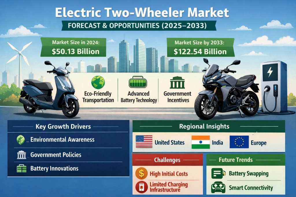 The global electric two-wheeler market is entering a dynamic growth phase as the world accelerates its transition toward sustainable transportation. With a projected market value of US$ 122.54 billion by 2033, the industry presents enormous opportunities for manufacturers, investors, and policymakers.