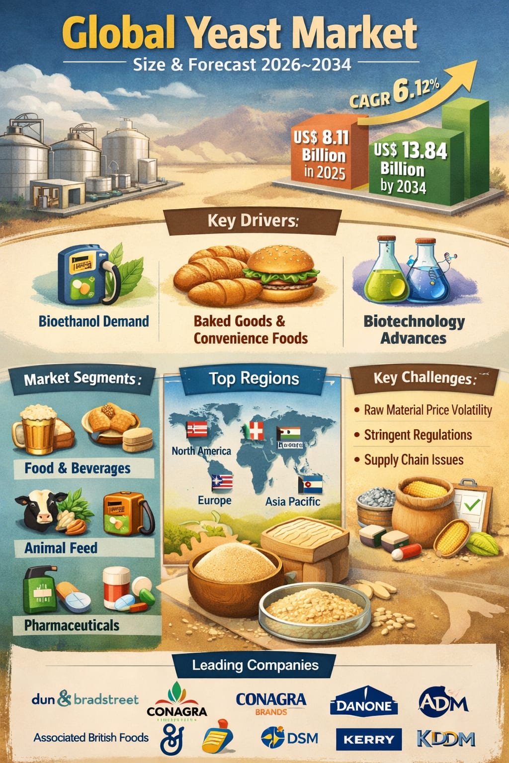 The global yeast market is entering a dynamic growth phase, supported by expanding applications across food processing, bioethanol production, animal nutrition, pharmaceuticals, and biotechnology. According to industry insights, the Yeast Market is expected to reach US$ 13.84 billion by 2034, up from US$ 8.11 billion in 2025, registering a CAGR of 6.12% from 2026 to 2034.
