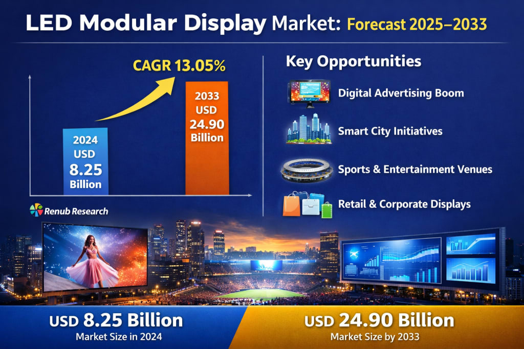 The global LED Modular Display Market is experiencing remarkable expansion as businesses and governments increasingly rely on dynamic visual communication technologies. According to Renub Research, the LED modular display market was valued at USD 8.25 billion in 2024 and is projected to reach USD 24.90 billion by 2033, growing at a compound annual growth rate (CAGR) of 13.05% from 2025 to 2033.