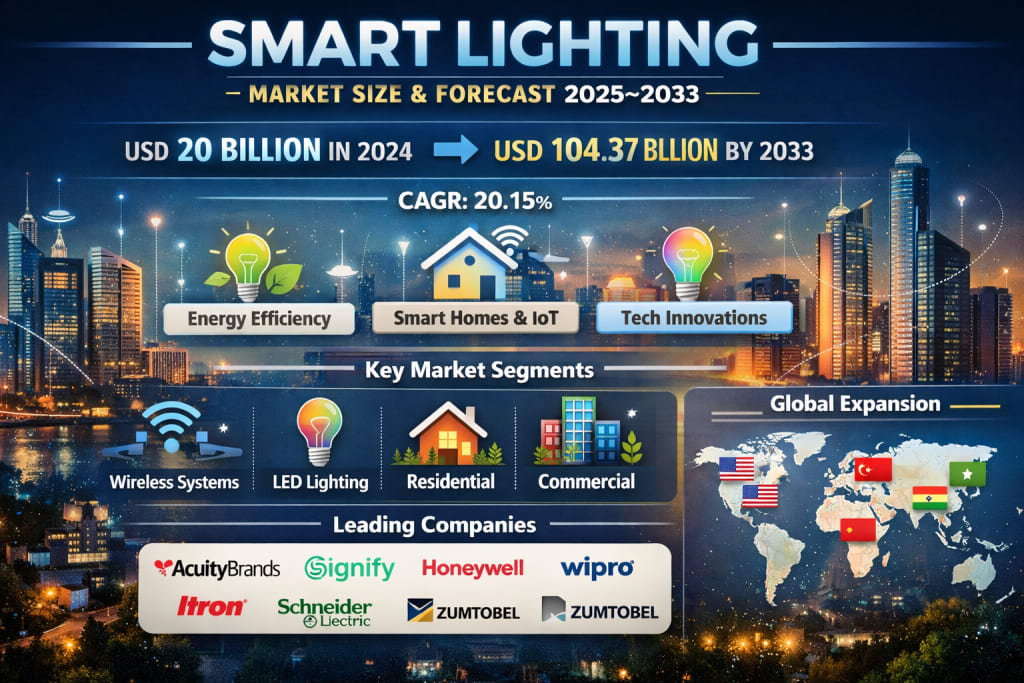 The global Smart Lighting Market is entering a transformative growth phase as technology-driven solutions reshape how people illuminate homes, workplaces, and public spaces. According to Renub Research, the smart lighting market size was valued at USD 20 billion in 2024 and is projected to reach USD 104.37 billion by 2033, expanding at an impressive compound annual growth rate (CAGR) of 20.15% from 2025 to 2033.