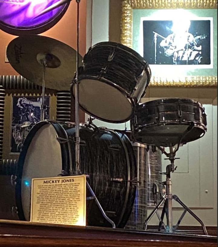 We were talking, catching up, watching the music videos playing on every screen, and checking out the memorabilia. No, really, lots of memorabilia. One of Elton John’s stage outfits, another of Beyonce’s. Bill Clinton’s sax. Scribblings and song notes from Jim Morrison and John Lennon.